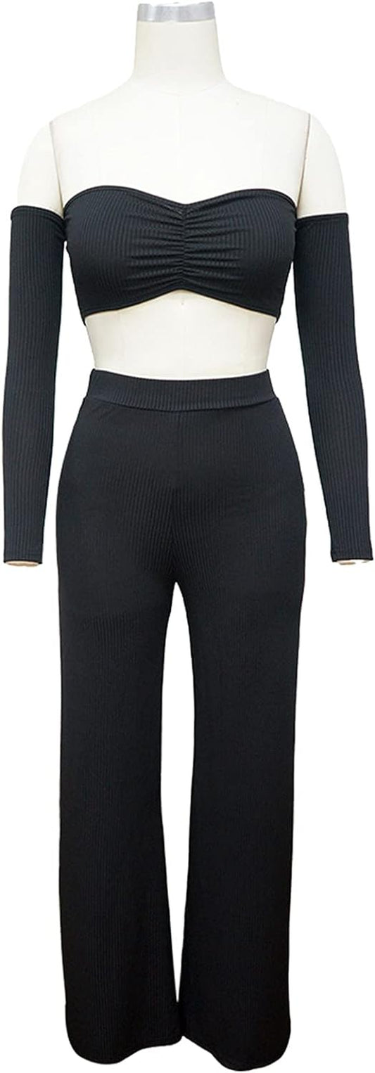 Women'S Sexy 2 Piece Outfits Clubwear off the Shoulder Crop Tops Long Loose Pant Set Long Sleeve Club Jumpsuits Black L